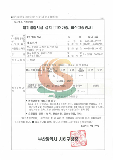 대기배출시설 설치 신고증명서